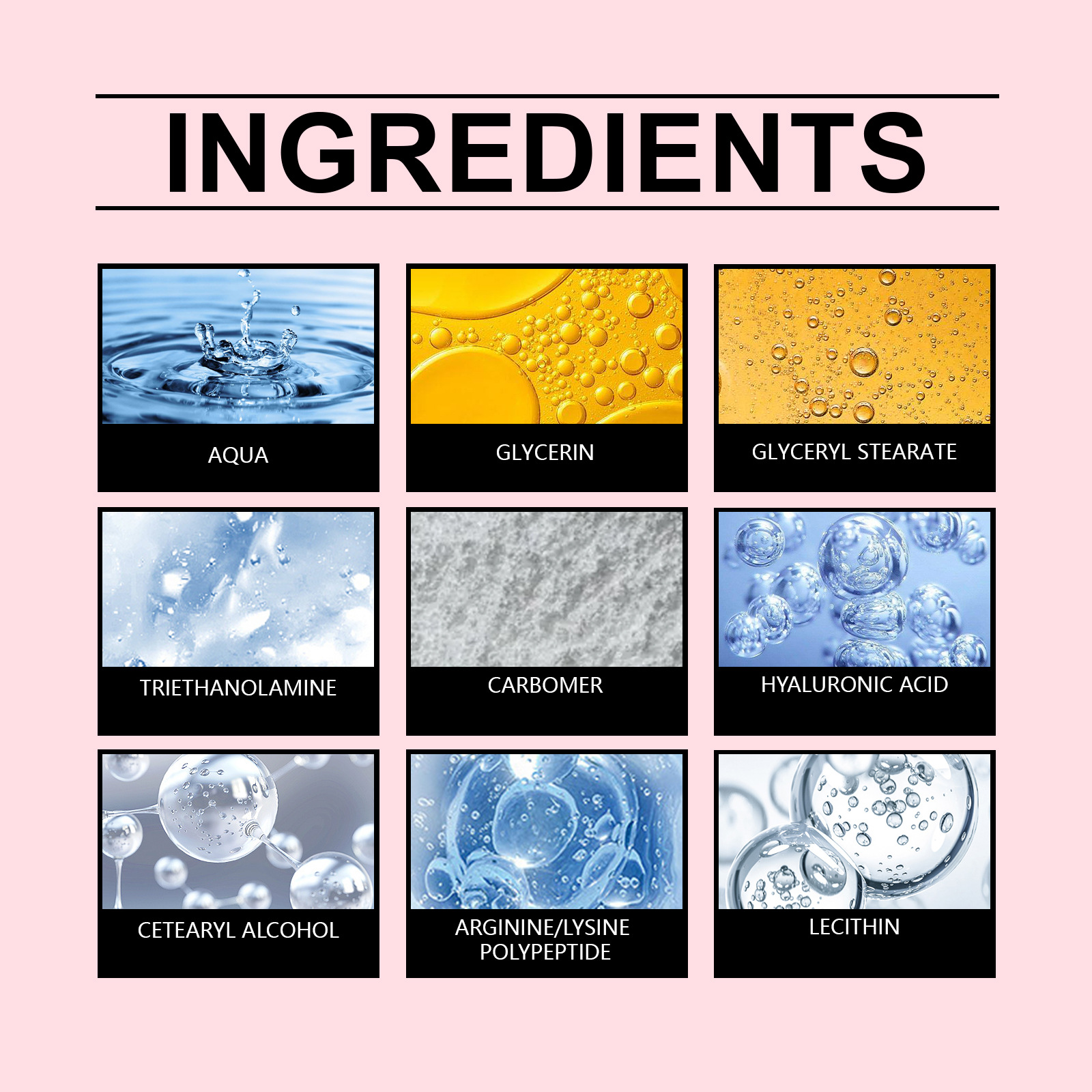 Ingredients: Water, glycerin, cetyl stearate, Glyceryl stearate, carbomer, triethanolamine, hyaluronic acid, arginine/lysine polypeptide, lecithin